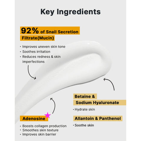 Snail Secretion Filtrate, Betaine, Caprylic/Capric Triglyceride, Butylene Glycol, Cetearyl Olivate, Sorbitan Olivate, Cetearyl Alcohol, Carbomer, Ethyl Hexanediol, Phenoxyethanol, Arginine, Dimethicone, Sodium Polyacrylate, Sodium Hyaluronate, Allantoin, Palmitic Acid, Panthenol, Xanthan Gum, Stearic Acid, Adenosine, Aqua/Water, Myristic Acid