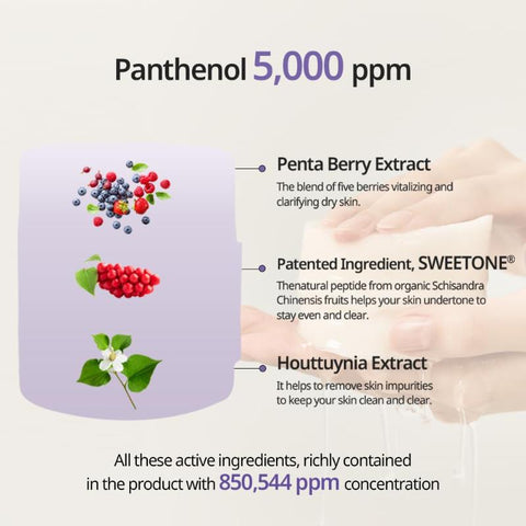 Houttuynia Cordata Water(845,544Ppm), Butylene Glycol, Propanediol, Methylpropanediol, 1,2-Hexanediol, Glycerin, Panthenol (5,000Ppm), Sodium Citrate, Gluconolactone, Lactobionic Acid, Allantoin, Water, Ethylhexylglycerin, Xanthan Gum, Disodium EDTA, Maltodextrin, Saccharide Hydrolysate, Vaccinium Macrocarpon (Cranberry) Fruit Extract, Fragaria Chiloensis (Strawberry) Fruit Extract, Rubus Idaeus (Raspberry) Fruit Extract, Vaccinium Angustifolium (Blueberry) Fruit Extract, Cornus Officinalis Fruit Extract, Euterpe Oleracea Fruit Extract, Sambucus Nigra Fruit Extract, Schisandra Chinensis Fruit Extract, Panax Ginseng Berry Extract, Vaccinium Myrtillus Fruit Extract