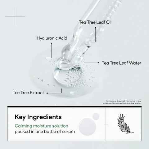 Aqua/Water, Glycerin, Butylene Glycol, 2,3-Butanediol, Methylpropanediol, 1,2-Hexanediol, Melaleuca Alternifolia (Tea Tree) Leaf Water, Panthenol, C12-14 Alketh-12, Sodium Hyaluronate, Carbomer, Tromethamine, Ammonium Acryloyldimethyltaurate/ VP Copolymer, Ethylhexylglycerin, Allantoin, Melaleuca Alternifolia(Tea Tree) Leaf Oil, Xanthan Gum, Melaleuca Alternifolia (Tea Tree) Extract, Melaleuca Alternifolia (Tea Tree) Leaf Extract, Beta-Glucan, Tocopherol, 4-Terpineol, Zinc Pca, Dipropylene Glycol, Pentylene Glycol, Caprylyl/ Capryl Glucoside, Hydrogenated Lecithin, Ceramide NP