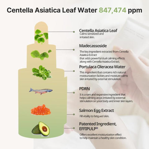 Lyxig laxrom, centella-extrakt och panthenol hjälper effektivt till att lindra rodnad och irritation. Den antioxidantfyllda ampullen innehåller även hyaluronsyra, klorofyll och madecassoside för att stärka och skydda huden, samtidigt som den gör den fylligare.